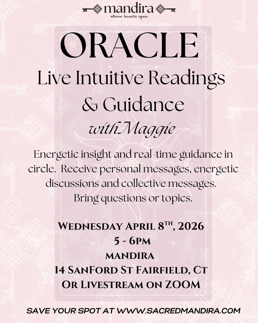 ORACLE is a live group circle where intuitive insight, real-time readings, and spiritual discussion come together in a shared field.